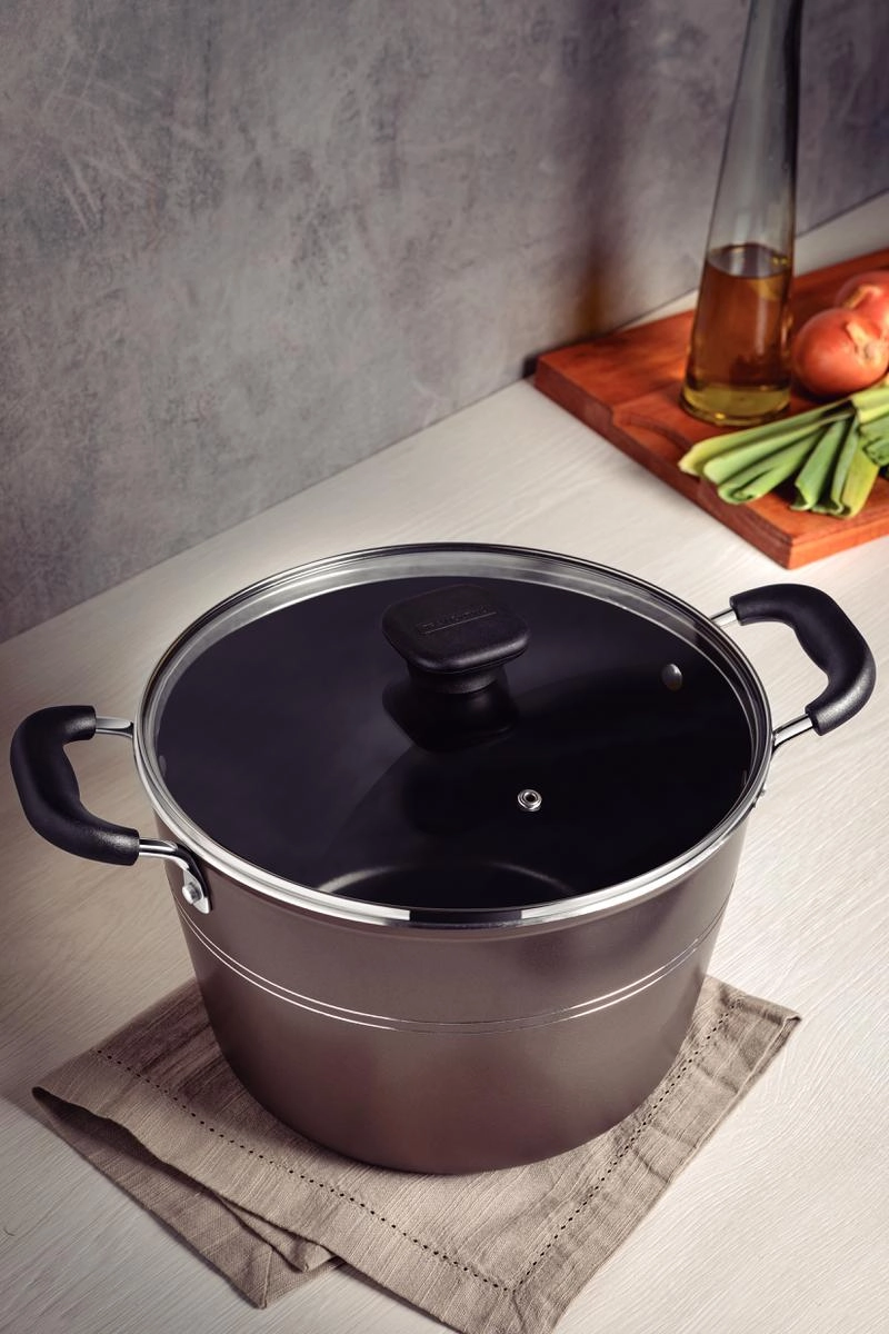 Com o caldeirão Tramontina Sicília em alumínio com revestimento interno e externo em antiaderente Starflon Excellent com tampa de vidro 24 centímetros de diâmetro 5,7 litros você poderá preparar aquela feijoada deliciosa para toda sua família e amigos.